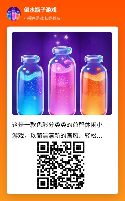 这是一款色彩分类类的益智休闲小游戏,以简洁清新的画风、轻松解压的玩法,让玩家通过倒水操作完成颜色归类,适合碎片化时间挑战